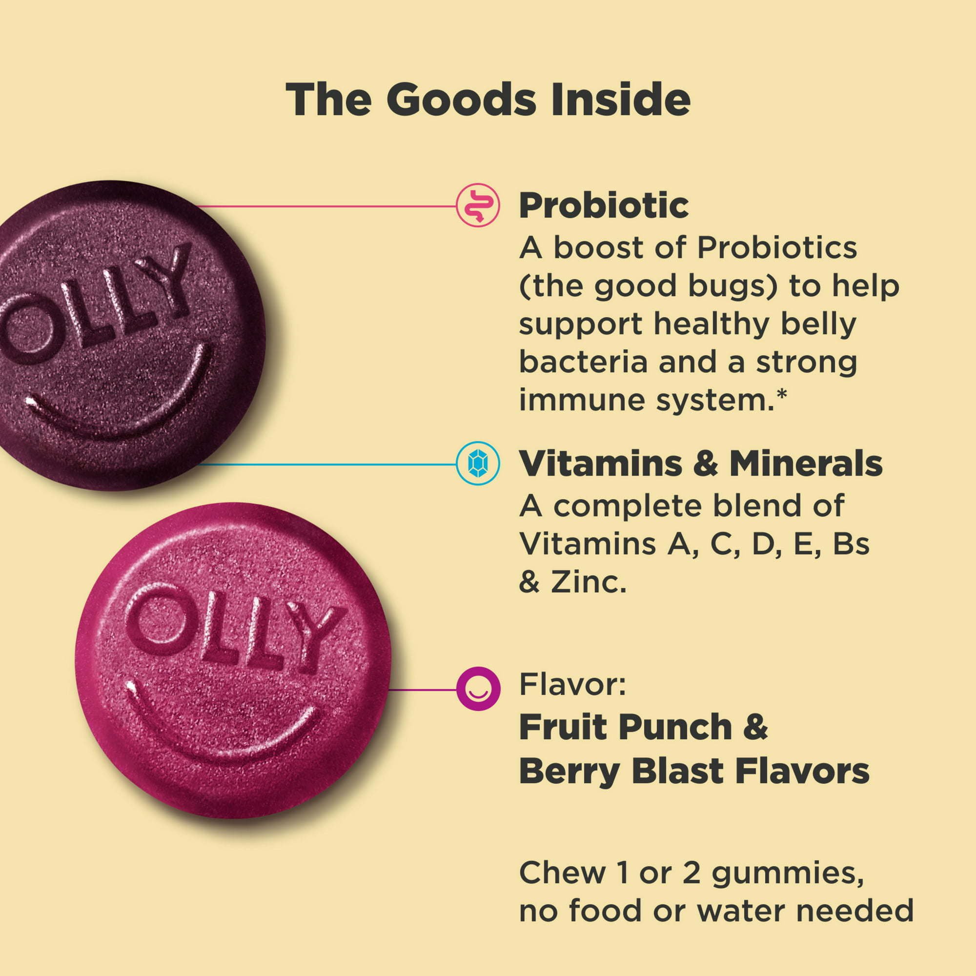 A win-win. OLLY kids multivitamins are packed with all the good stuff kiddos need to thrive, like Vitamins A, C, D, Bs and Zinc, in a delicious gummy they'll actually enjoy. The chewable daily vitamin for kids also delivers a super dose of probiotics to help support healthy belly bacteria and a strong immune system.*OLLY kids vitamins are super delicious, scientifically formulated and gluten free. Kiddos 2-3 years, chew one vitamin daily and 4 years and up, chew two daily. No food or water needed.*Good health is at the center of everything we do. That's why we’ve made it our mission to make nutrition easy to understand. We do it by crafting products that are as effective as they are delicious—because we know when something feels good, you’re more likely to do it.**These statements have not been evaluated by the Food and Drug Administration. This product is not intended to diagnose, treat, cure or prevent any disease.